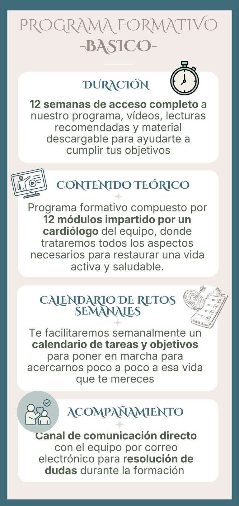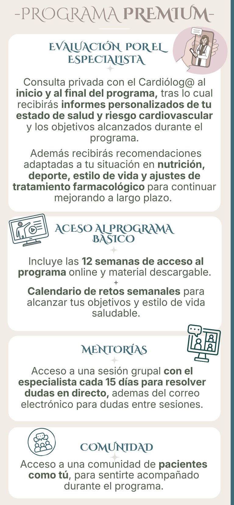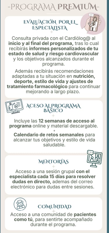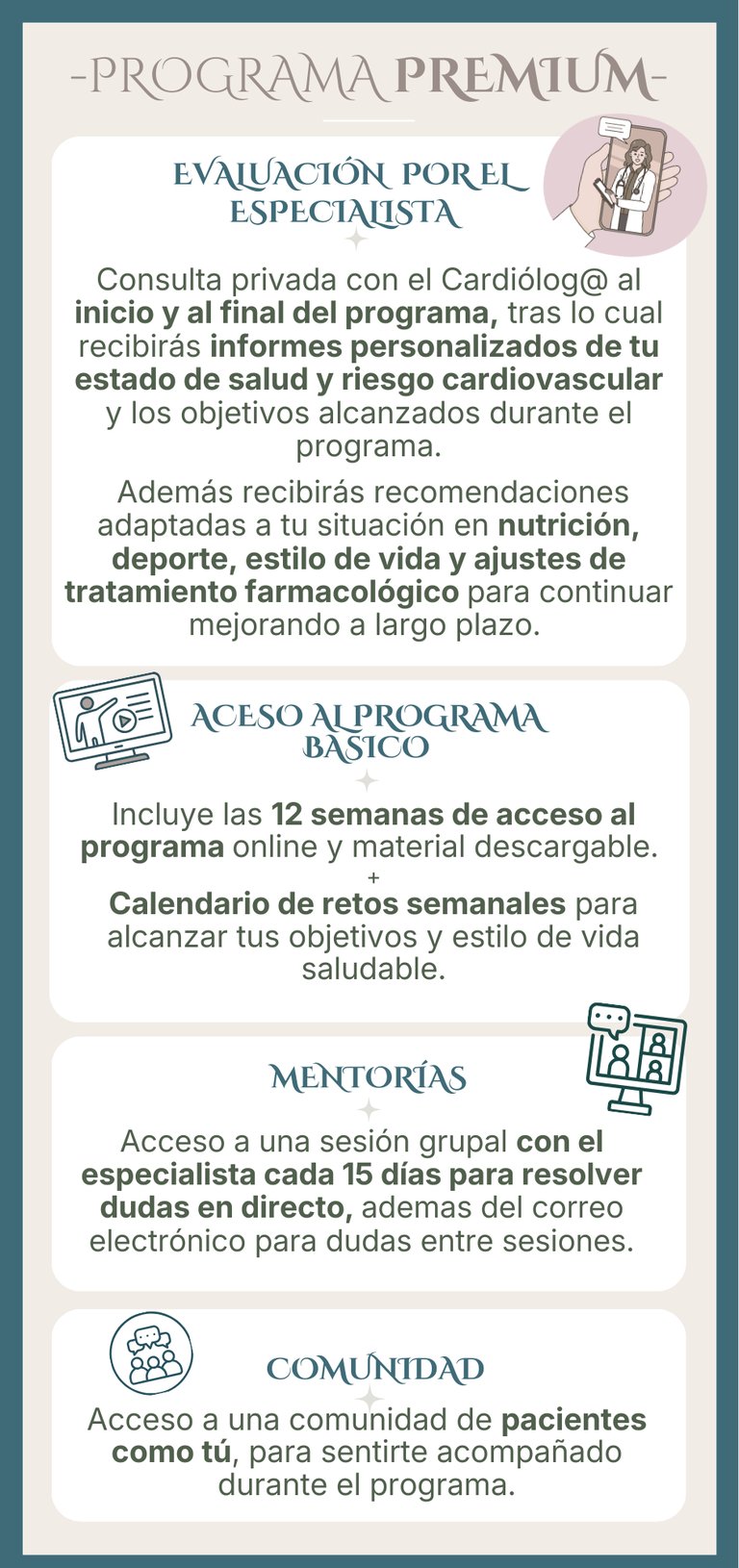 En el programa de rehabilitación específicamente diseñado para pacientes cardiológicos, tendrás acceso a la plataforma con contenido audiovisual, donde podrás adquirir conocimientos importantes para tu salud cardiovascular con un enfoque integrativo y siguiendo un calendario semanal estructurado