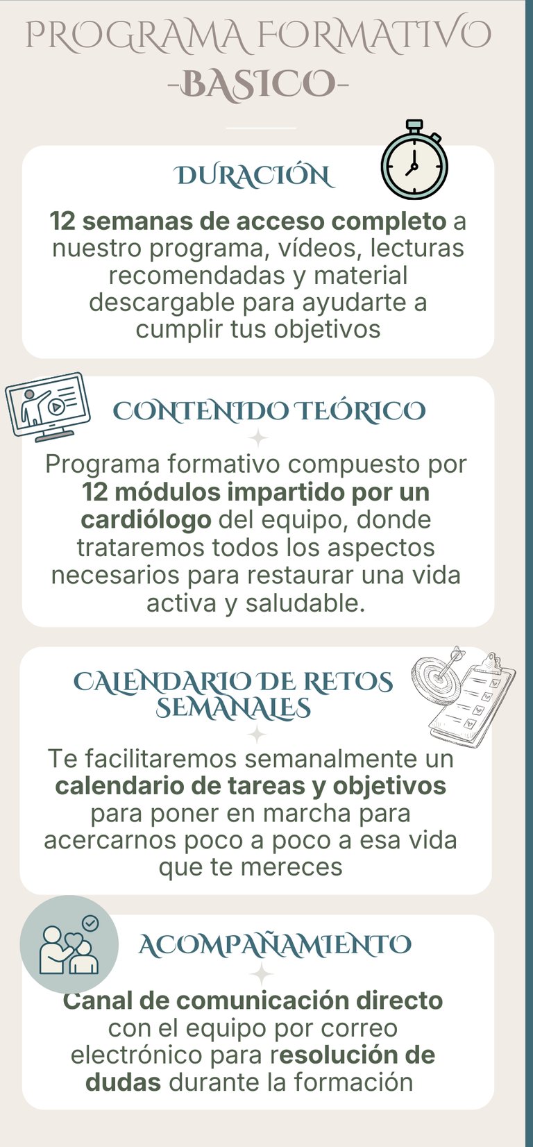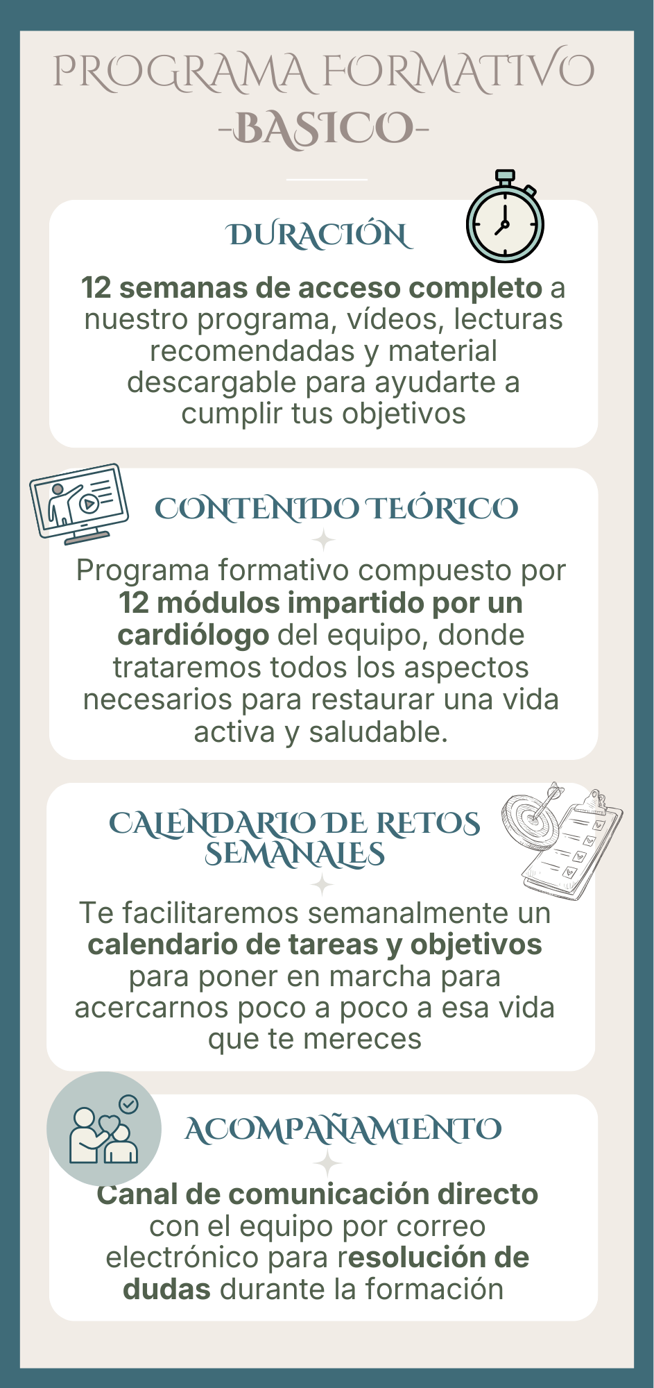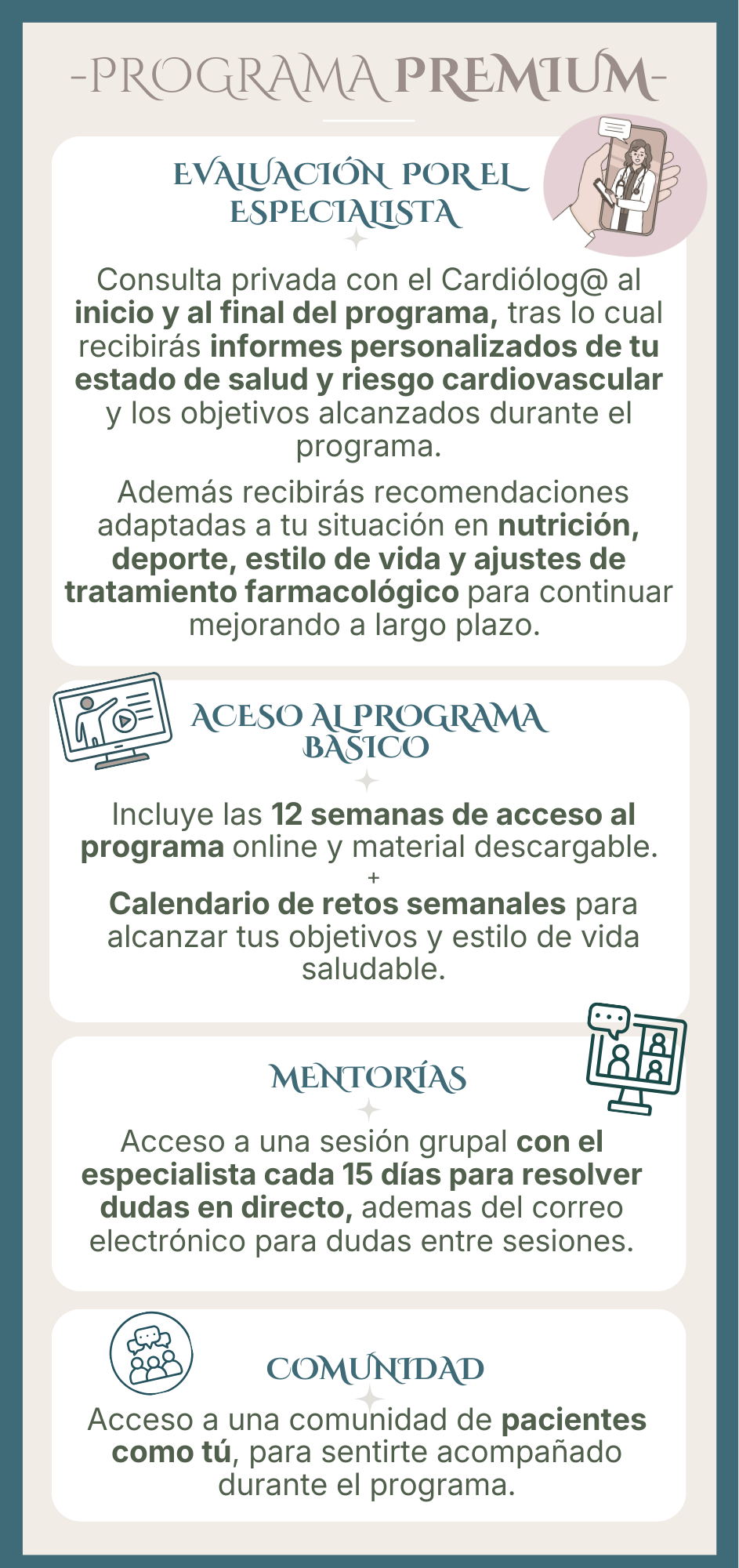 En el programa de rehabilitación específicamente diseñado para pacientes cardiológicos, tendrás acceso a la plataforma con contenido audiovisual, donde podrás adquirir conocimientos importantes para tu salud cardiovascular con un enfoque integrativo y siguiendo un calendario semanal estructurado