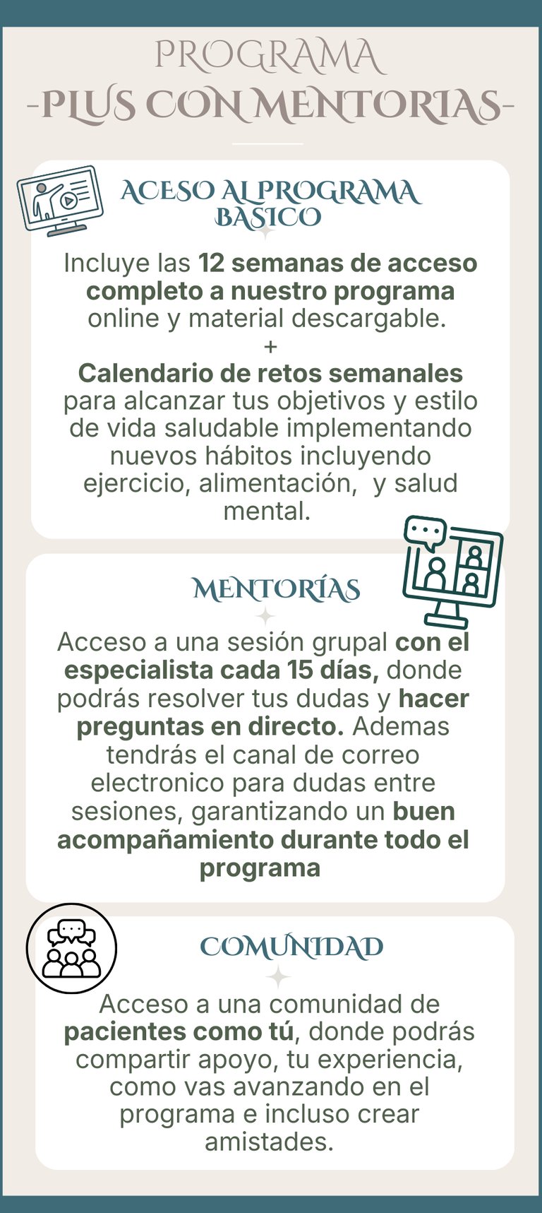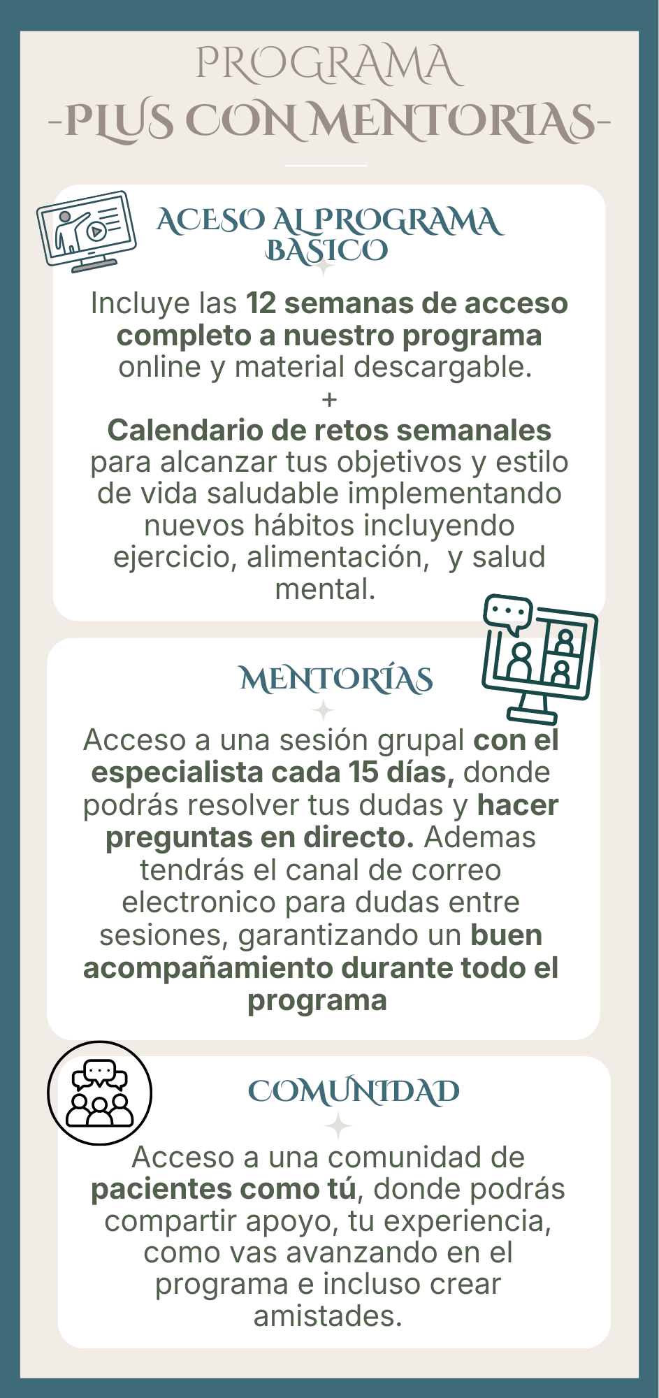 Acceso a sesiones grupales en directo y una comunidad con pacientes como tú.