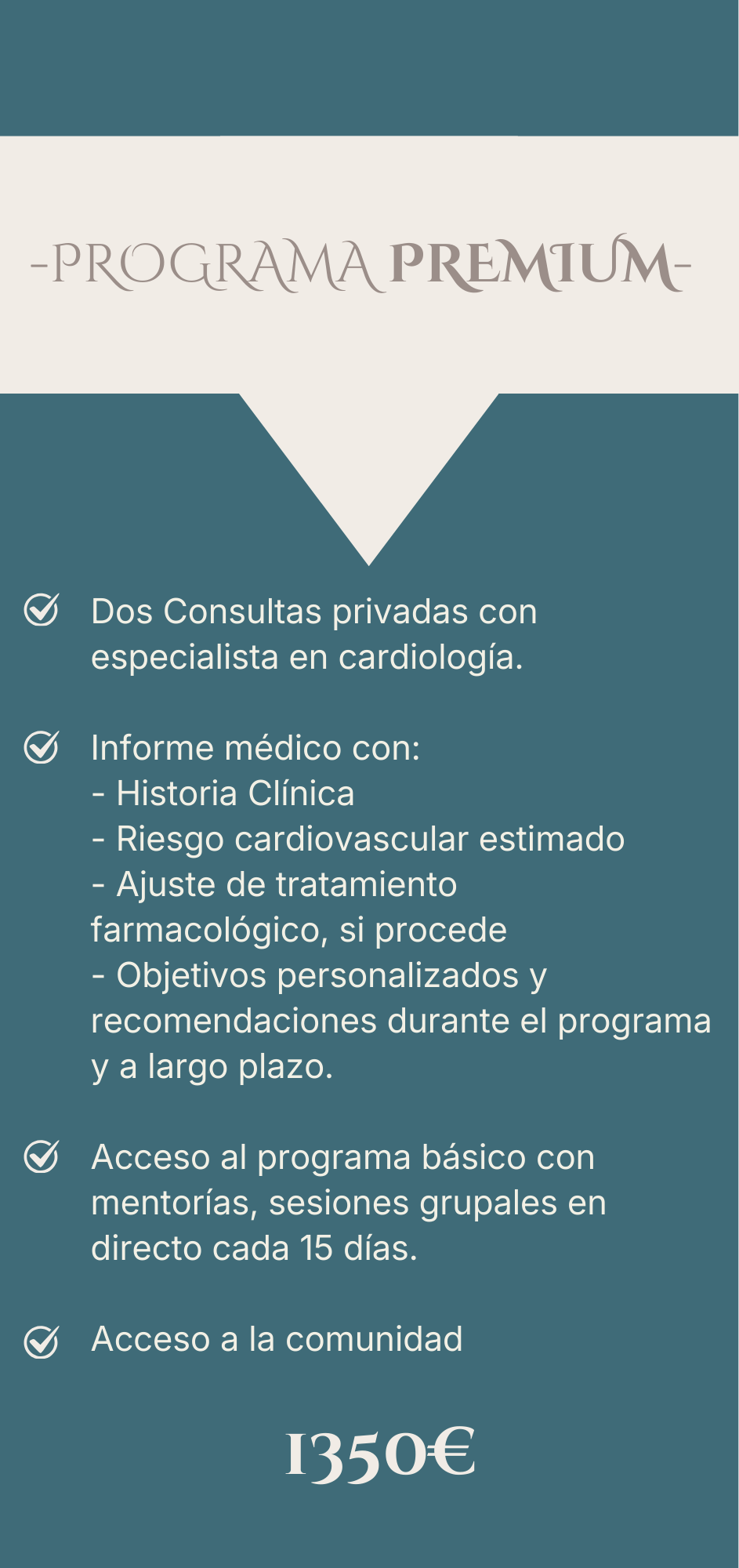Acceso a una o varias evaluaciones individuales por el especialista, recibirás un informe médico personalizado con tu situación basal y calendario con objetivos a alcanzar durante el programa .
