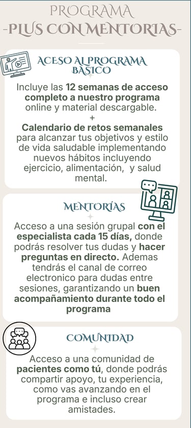 Acceso a sesiones en directo grupales con el especialista durante el todo el programa, en las que, además de aprender, puedes preguntar lo que quieras y enriquecerte con las experiencias de otros pacientes como tú.